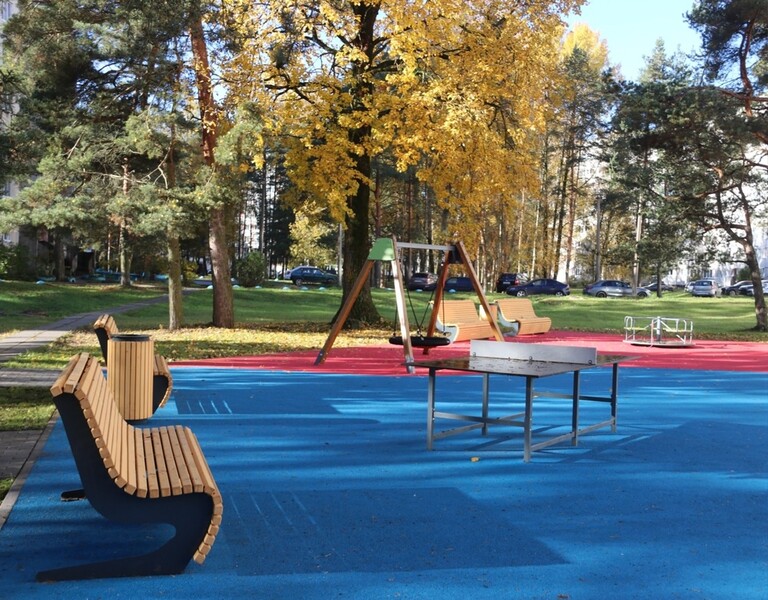 Благоустроенная территория разделена на несколько площадок: зона для тихого отдыха с уличными качелями, детская игровая и спортивная площадки. Пешеходные дорожки обустроены с учетом сложившегося маршрута, установлены скамейки, урны и освещение.