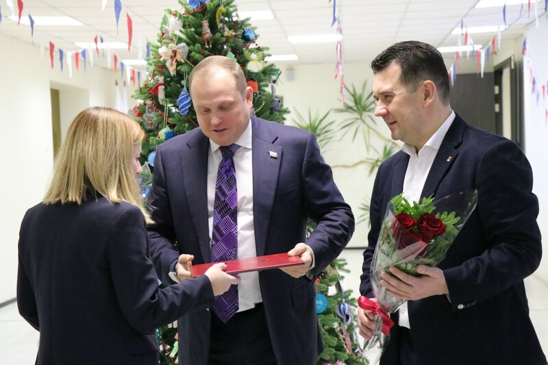Помощник сенатора РФ Дмитрия Василенко - депутат Законодательного собрания Ленинградской области Михаил Коломыцев от себя и своего коллеги Андрея Гардашникова поздравил отличившихся работников Кировского района, вручил им Благодарности и Почетные дипломы Законодательного собрания Ленинградской области .